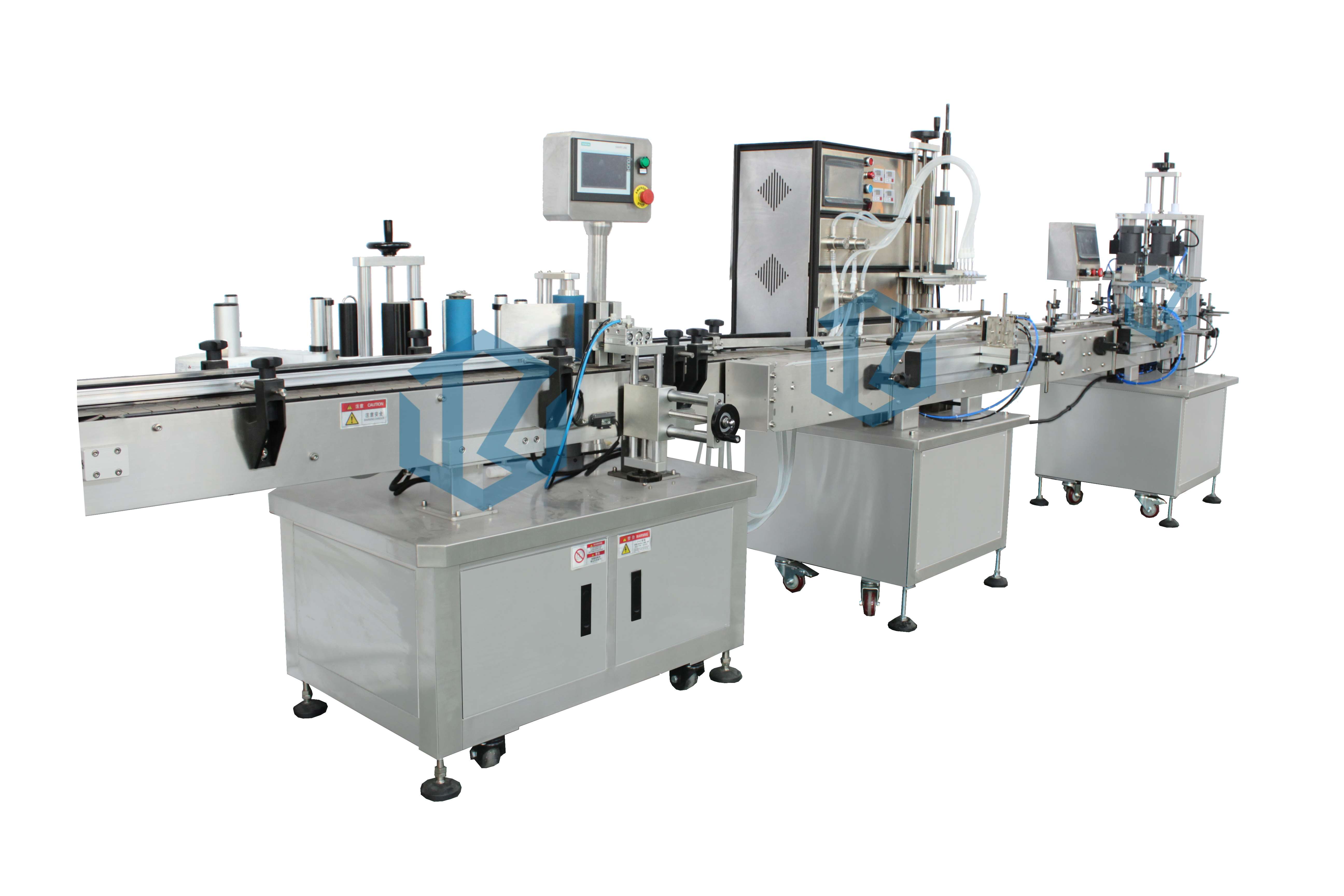 完成動作:人工放瓶-自動灌裝-機器放蓋-自動旋蓋–自動貼標(biāo)-人工收瓶